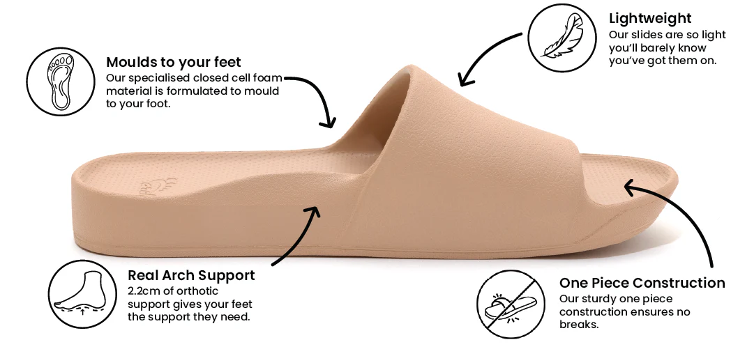 A pair of arch support Slides so comfy and supportive, you'll never want to take them off your feet!