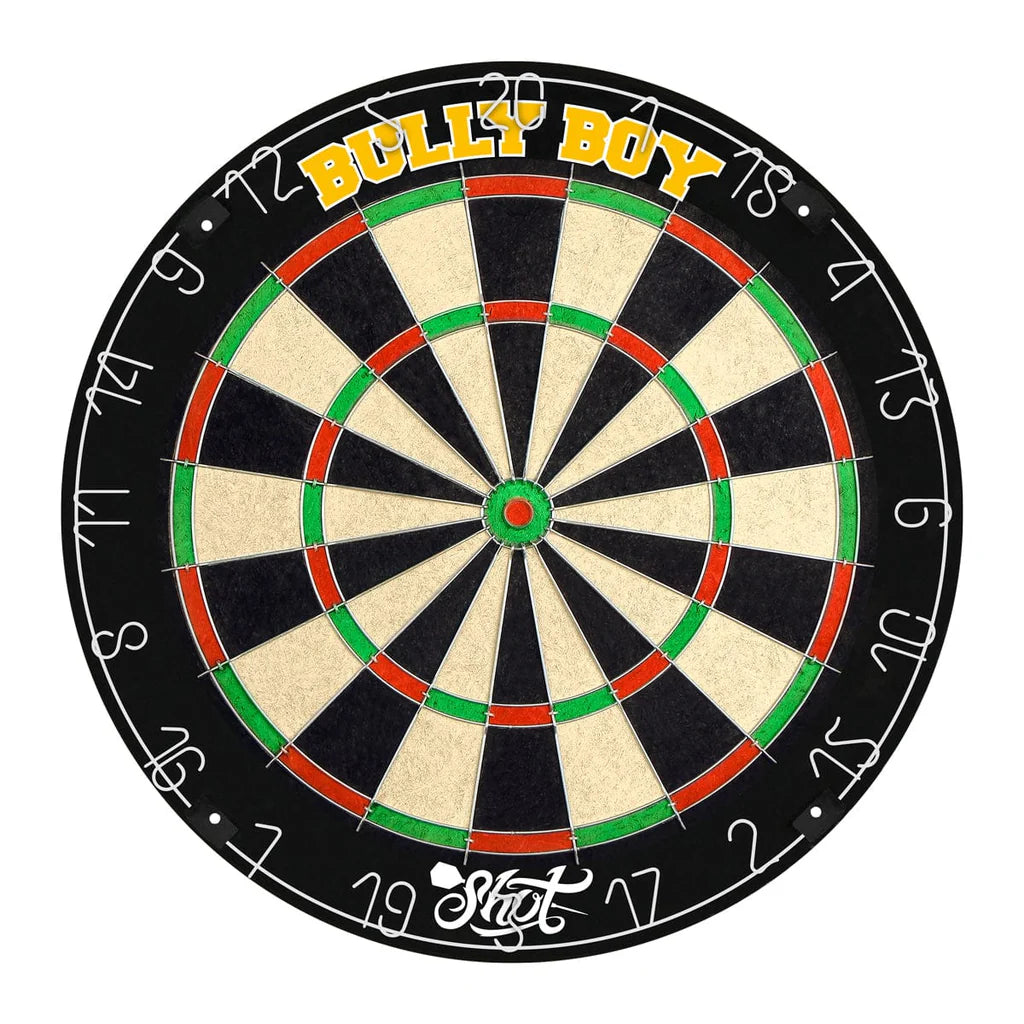 This easy-to-install competition-sized dartboard is ready for you to hang and play on right away. Grab your darts and bring the noise! The Official Michael Smith "Bully Boy" dartboard is manufactured from quality sisal bristle fibres. It includes a removable number ring for even surface wear and longer life. Crafted with vibrant, long-lasting colours, strong slim round wire construction, and a staple free bullseye. This sleek staple-free technology means fewer bounce-outs and consistently better scores.